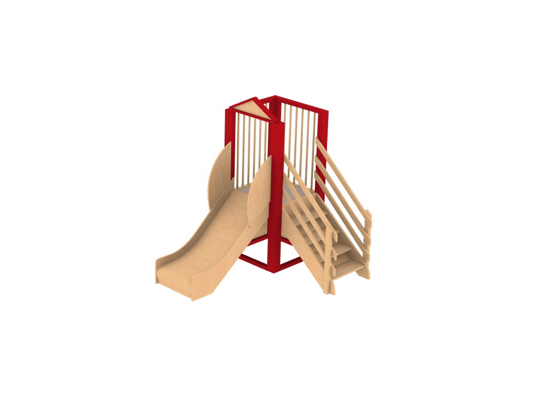 Bereich oben: Gitterelemente oder Panellrückwände, inkl. Treppe (beidseitig mit Geländer) und Rutsche, Durchgang zur Rutsche mit Spitzdach. Grundfläche der Spielebene 70 x 70 cm