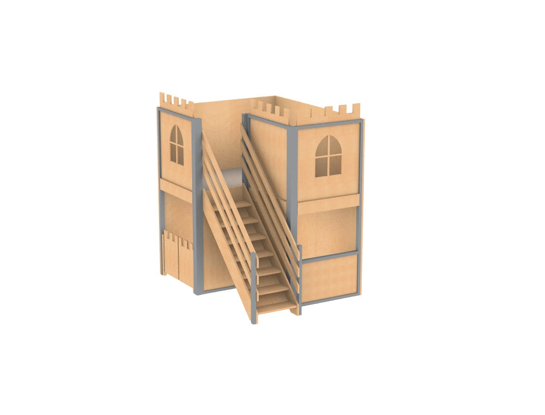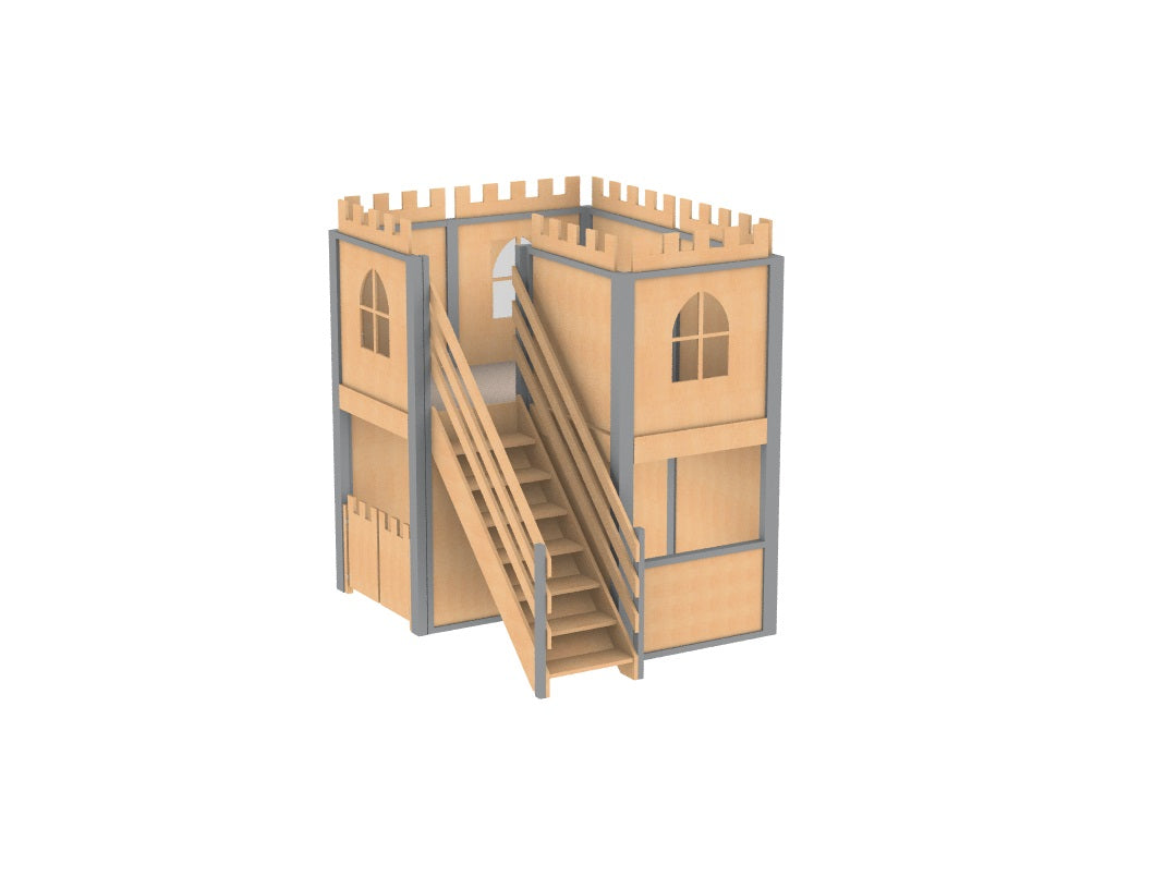 bestehend aus: Burgelementen mit Fenstern (mit Plexiglas hinterlegt), geschlossene Elemente unten mit Pendeltür und offenen Elementen, inkl. Treppe (beidseitig mit Geländer) Grundfläche der Spielebene: 175 x 205 cm, Platzbedarf: 200 x 250 cm, Treppenüberstand: 30 cm, Podesthöhe: 135 cm, Gesamthöhe: 236 cm + Aufsatz.